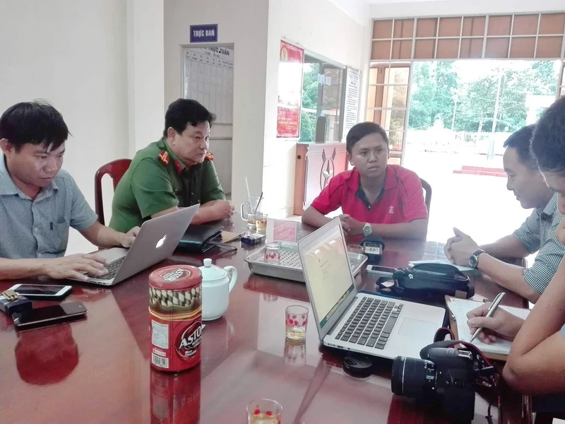 Trung úy Nguyễn Văn Thành (mặc áo đỏ) đang trả lời báo chí về việc xử lý vi phạm đối với chiếc xe chở trung tướng Võ Văn Liêm. Ảnh: TÍN HUY
