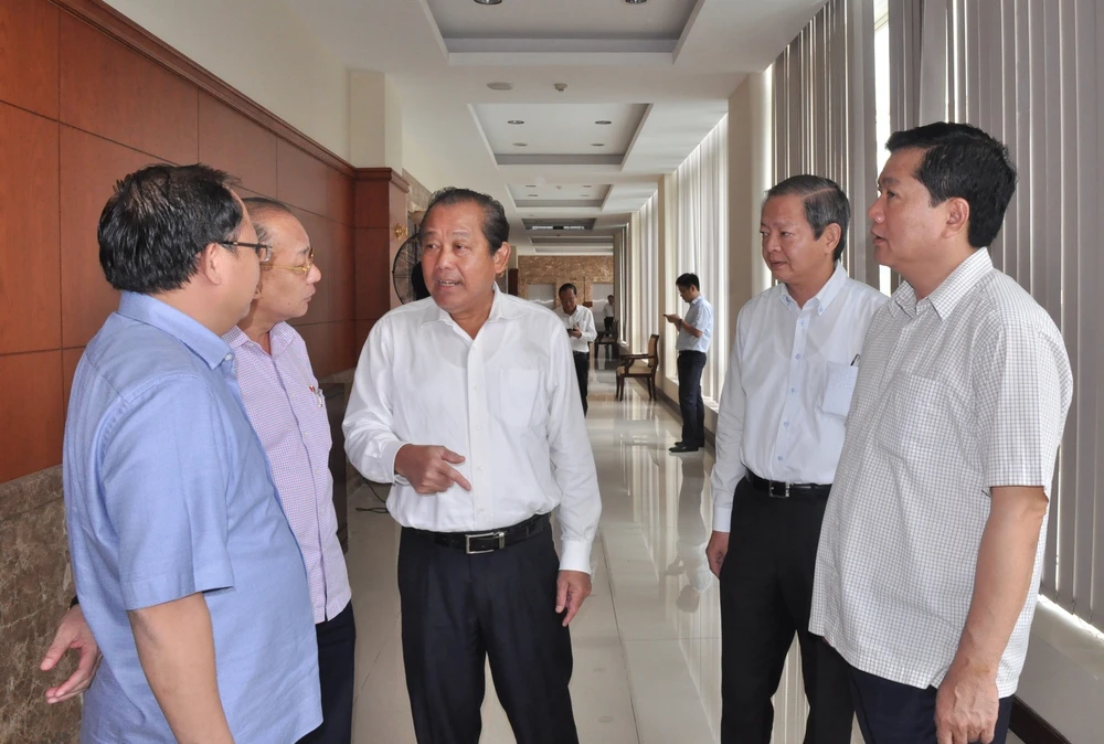 Phó Thủ tướng Trương Hòa Bình trao đổi với Bí thư Thành ủy TP.HCM Đinh La Thăng cùng các đại biểu bên lề buổi làm việc. Ảnh: THANH XUÂN