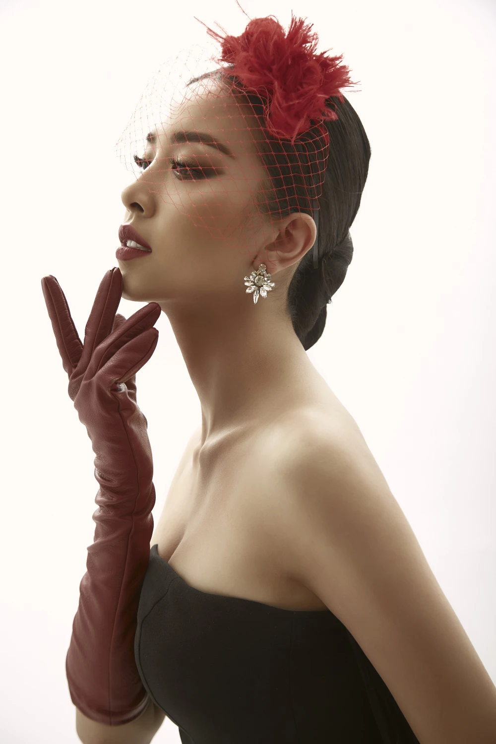 Mạng che mặt, đôi môi đỏ mọng, găng tay da và đầm cúp ngực khoe khéo bờ vai trần gợi cảm là những items thống trị làng mốt thập niên 90 đã được Thúy An khéo léo kết hợp để phô diễn vẻ đẹp hiện đại chuẩn quốc tế của mình.