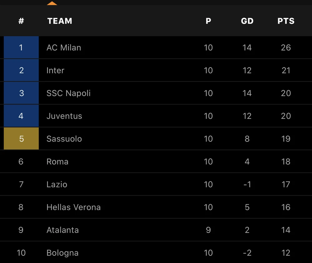 Sau loạt đấu tại vòng 10, có thể thấy rằng các đội bóng mạnh của Serie A đã bắt đầu bước vào cuộc đua giành chức vô địch Scudetto đầy khắc nghiệt ở mùa giải năm nay. Bốn vị trí đầu bảng lần lượt thuộc về: AC Milan, Inter Milan, Napoli và ĐKVĐ Juventus. Sassuolo đang gây ấn tượng khi có vị trí thứ 5 xếp trên là Lazio và AS Roma.