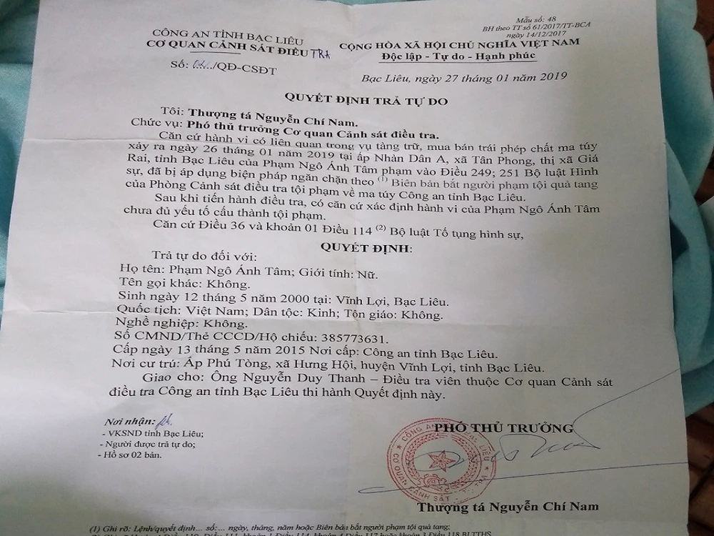 Kèm theo thông tin trên, Ánh Tâm gửi cho chúng tôi Quyết định trả tự do của Cơ quan cảnh sát điều tra Công an tỉnh Bạc Liêu.