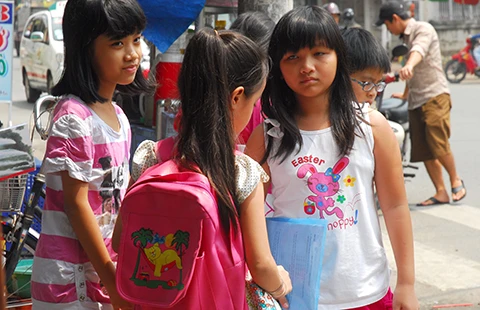 Các học sinh tiểu học chuẩn bị vào lớp tại một điểm học thêm ở TP.HCM. Ảnh: HTD