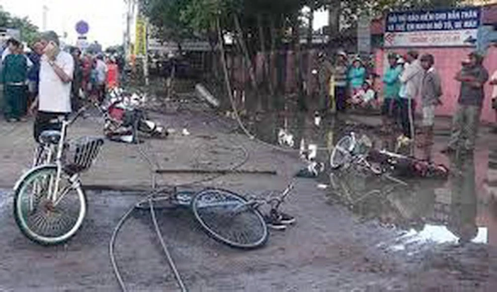 Hiện trường một vụ đứt, rớt dây điện gây tai nạn cho người đi đường mùa mưa năm 2018. Ảnh: Từ Internet