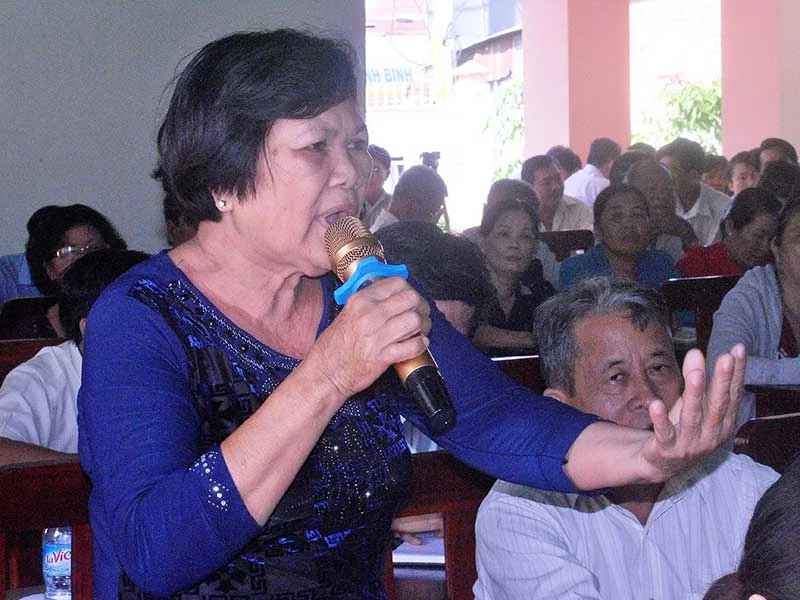 Cử tri Đỗ Thị Cưỡng (huyện Củ Chi, TP.HCM) nêu ý kiến tại buổi tiếp xúc với tổ đại biểu Quốc hội TP.HCM đơn vị số 9. Ảnh: TÁ LÂM