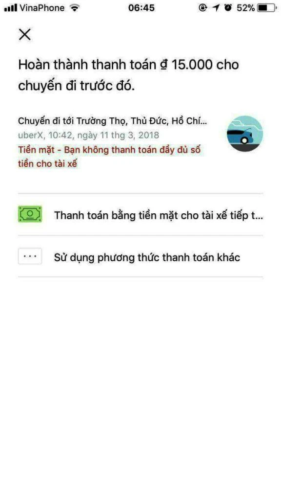 Theo đó, chị NTVH, Thủ Đức (TP.HCM) bức xúc: “Tôi đặt xe từ phường Trường Thọ, quận Thủ Đức đến quận Tân Bình. Trong quá trình đi xe, tôi đã thanh toán đầy đủ bằng tiền mặt. Tuy nhiên, ngay sau khi tôi thanh toán thì trên app của Uber đã hiện lên nội dung yêu cầu tôi phải hoàn thành thanh toán 15.000 đồng cho chuyến đi trước đó. Quá bức xúc, tôi đã liên hệ với đường dây nóng của Uber nhưng đều bị trả lời quanh co. Tiếp theo, hãng xe này yêu cầu tôi phản hồi qua email nhưng đến nay đã 10 ngày mà tôi vẫn chưa nhận được phản hồi nào”.