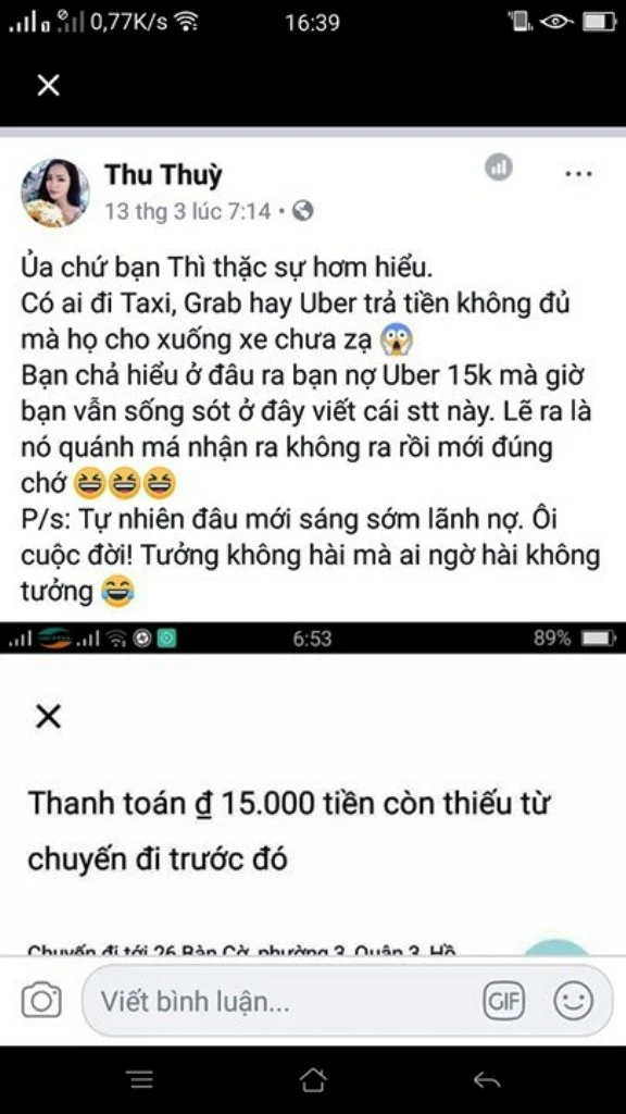 Quá bức xúc, chị Hoàng Thu Thủy cho biết: “Có ai đi taxi, Grap hay Uber không đủ tiền trả mà tài xế cho xuống xe không ạ? Tôi không hiểu tiền ở đâu ra mà tôi bị nợ 15.000 đồng, trong khi tôi không được đi. Thực ra 15.000 đồng không lớn nhưng tiền thì phải rõ ràng nếu Uber không trả lời rõ ràng về vụ này sẽ gây mất lòng tin cho khách hàng”.