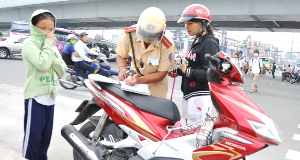 Đội CSGT Rạch Chiếc (thuộc phòng PC67) đang lập biên bản một trường hợp phụ huynh chở con đi học nhưng không đội MBH. Ảnh: MP.