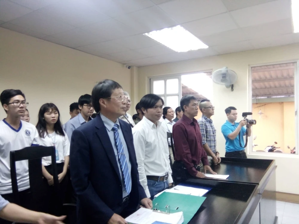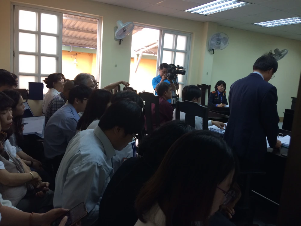 Gần 9 giờ phiên tòa bắt đầu, rất đông người đến tham dự phiên tòa. Phòng xử B (tầng trệt) tại trụ sở TAND quận 1 khá nhỏ nên không đủ chỗ cho những người đến tham dự. Rất đông người phải ngồi bên ngoài phòng, ngóng vào cửa bên hông theo dõi phiên xử.