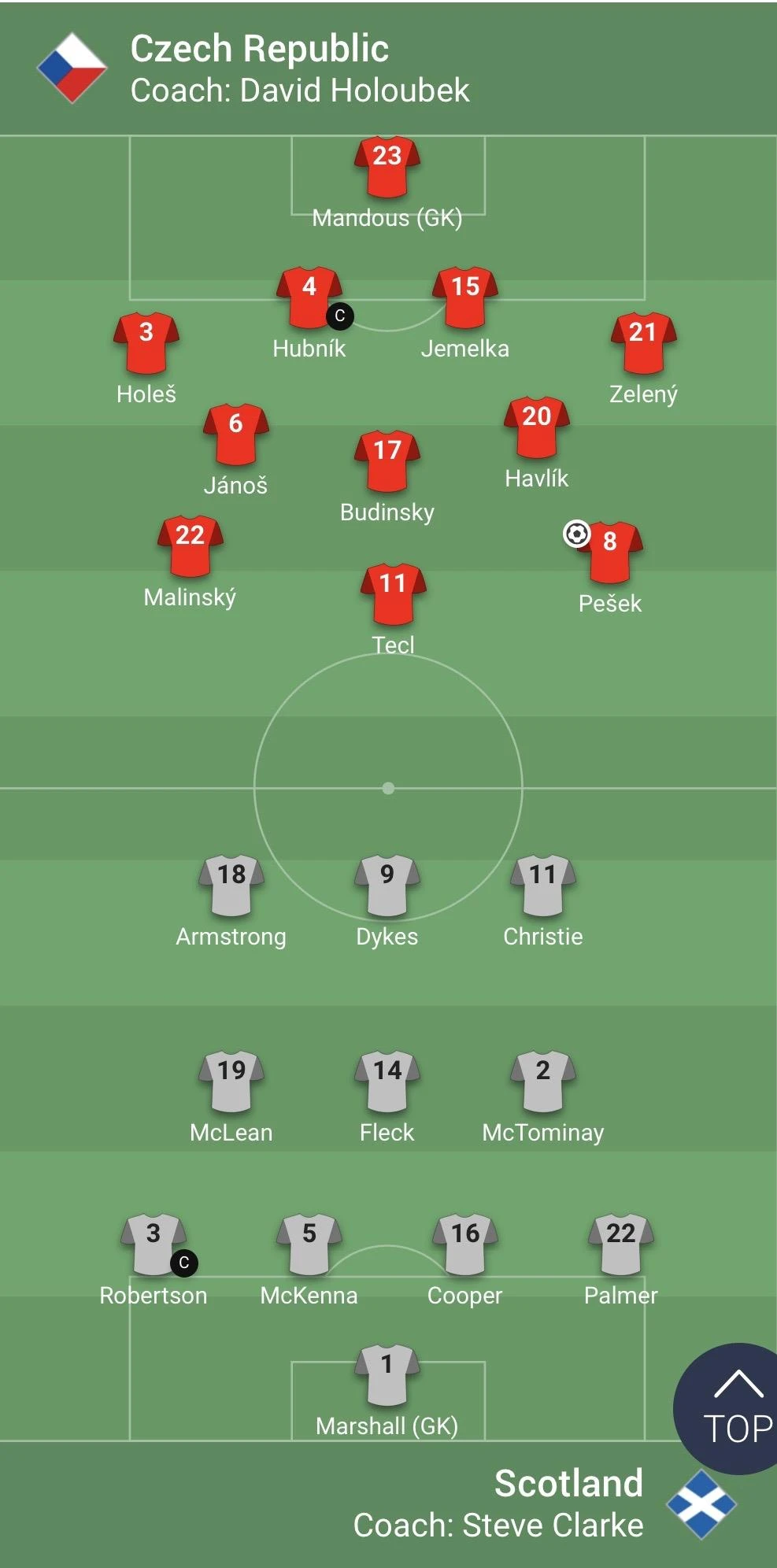 Ba thủ môn trong đội 1 Czech bị cách ly không thể thi đấu là Tomas Vaclik (thủ môn chính thức), Ondrej Kolar, Jiri Pavlenka. HLV David Holoubek của Czech phải gọi 3 thủ môn khác thay thế là Ales Mandous, Jakub Markovic và Filip Nguyen.