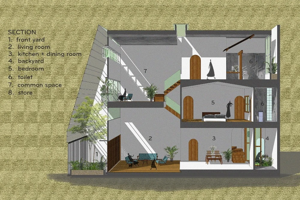 Một ngôi nhà ống với hình thái đất phổ biến trong các đô thị Việt Nam hiện nay, kiến trúc sư Nguyễn Công Toàn quyết định tạo ra một lõi không gian sống ở giữa được bao bọc bởi hai lớp không gian đệm là thiên nhiên, ánh sáng và gió tự nhiên.