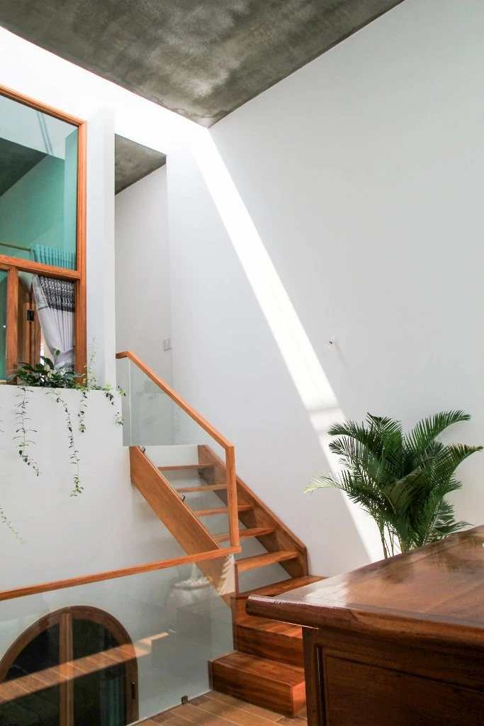 Trục giao thông theo chiều đứng được chia nhỏ và bố trí di chuyển xoay quanh ngôi nhà cùng những khoảng không gian đệm chuyển tiếp giúp kết nối, tăng cường sự tương tác giữa các thành viên trong gia đình. Ở mỗi khoảng đệm của giao thông là cảm nhận của không gian thay đổi gần gũi với thiên nhiên.