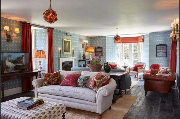 Khác với các gian phòng còn lại trong nhà có tông màu trầm, màu của phòng khách được pha thêm chút đỏ, vàng sang trọng, kết hợp hài hoà với tường xanh biển-là màu yêu thích của Megan. Sự kết hợp màu sắc này khiến gian phòng ấm áp, đầy sức sống. Ảnh: The Sun