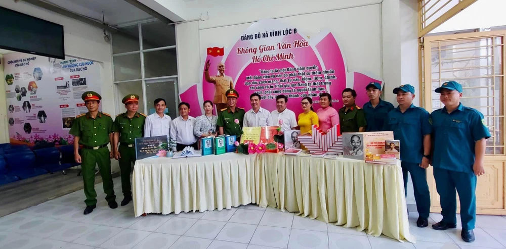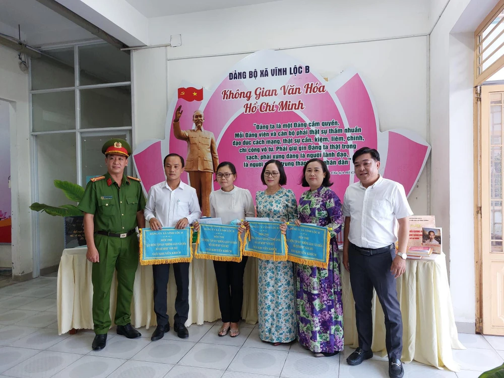 Tại buổi lễ ra mắt, ông Nguyễn Thành Nhân, Bí thư Đảng ủy xã Vĩnh Lộc B (bên phải) và bà Trần Thị Thái Nguyên, Chủ tịch UBND xã trao giải thưởng Hội thi xây dựng tập san “Không gian văn hoá Hồ Chí Minh” cho các đơn vị là các Chi bộ Trường học, các ấp trên địa bàn xã. |