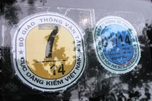 Tem kiểm định và tem nộp phí sử dụng được án lên xe. (Ảnh: Việt Hùng/Vietnam+)