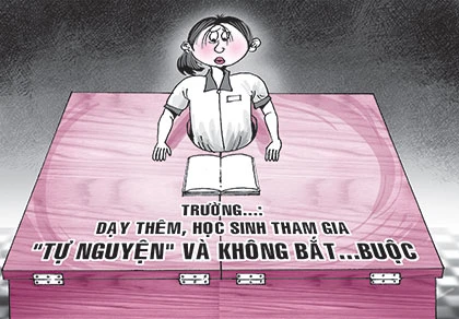 Theo quy định, học thêm trong nhà trường phải trên tinh thần tự nguyện của HS và được phụ huynh đồng ý. Tuy nhiên, đầu tuần qua trường đưa về cho các lớp danh sách đăng ký học thêm và bắt buộc con anh phải chọn bốn môn: toán, văn, Anh và một môn để thi tốt nghiệp chứ không được chọn môn theo ý muốn. Vì con anh muốn thi khối B (toán, hóa, sinh), cháu chỉ có nhu cầu học hai môn hóa, sinh thôi nhưng không được chọn.