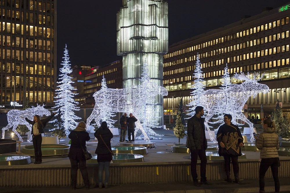 Các bạn trẻ hào hứng chụp ảnh với những tác phẩm trang trí rực sáng ở khu chợ trời bán đồ Giáng sinh ở Stockholm.