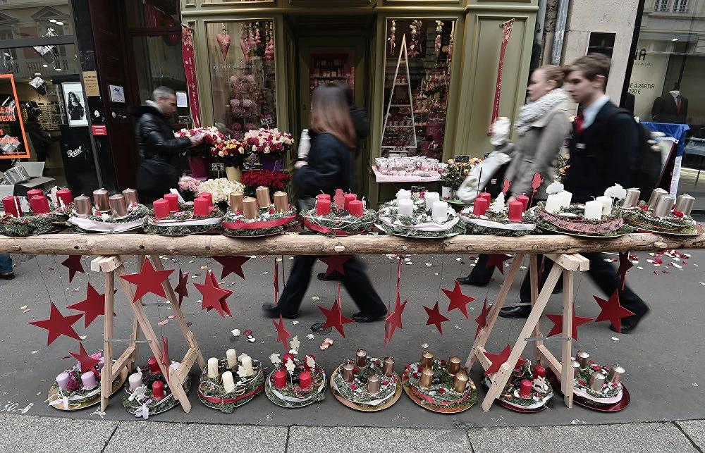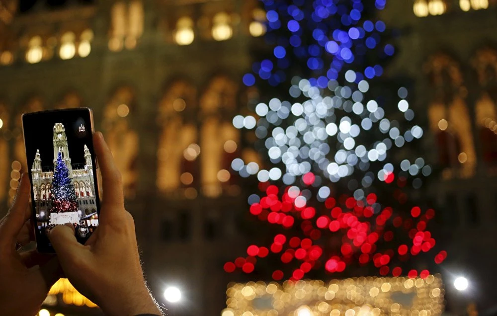 Một du khách chụp cây thông Noel với đèn thắp sáng ba màu trong quốc kỳ Pháp nhằm tưởng nhớ các nạn nhân vụ tấn công Paris ở Vienna, Áo.