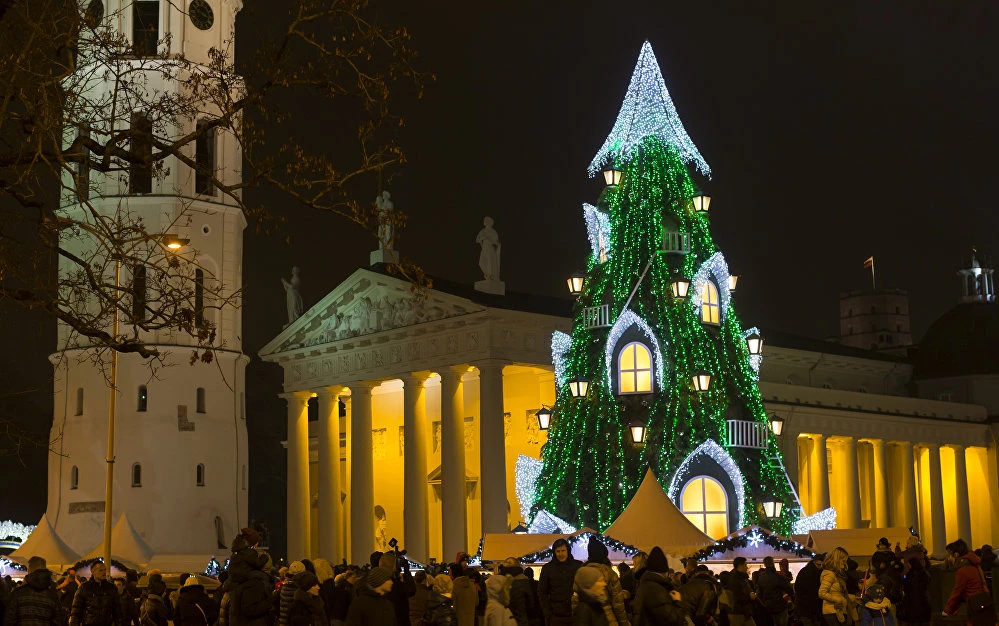 Cây thông Noel trong dịp lễ thắp sáng ở Quảng trường Cathedral, Vilnus, Lithuania.