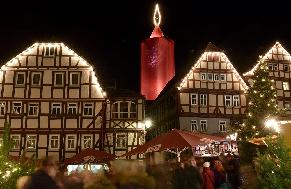 Các căn nhà khung gỗ rực sáng ở một hội chợ tổ chức tại thị trấn Schlitz, bang Hesse, Đức.