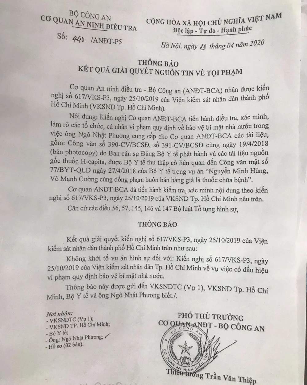 Cụ thể, ngày 25-10-2019, VKSND TP.HCM có kiến nghị gửi đến liên quan việc ông Phương cung cấp cho CQĐT một số tài liệu. Cụ thể là bản phôtô Công văn 390 ngày 19-4-2018 do Ban cán sự Đảng Bộ Y tế phát hành và các tài liệu nguồn gốc thuốc H-Capita, được Bộ Y tế thu thập liên quan đến Công văn mật số 77 ngày 27-4-2018 của Bộ Y tế trong vụ án này.
