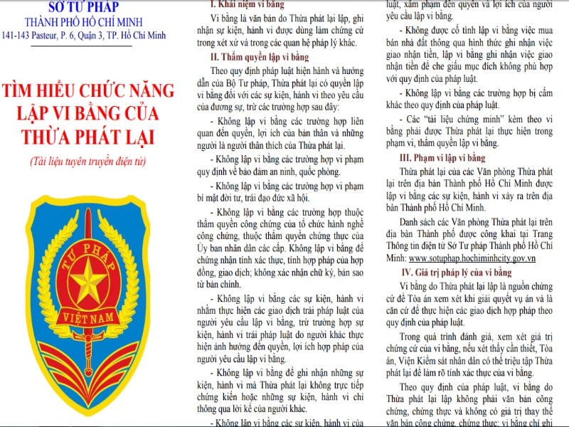 Tờ gấp này giải thích vi bằng là văn bản do TPL lập ghi nhận sự kiện, hành vi được dùng làm chứng cứ trong xét xử và trong các quan hệ khác. Các Văn phòng TPL trên địa bàn TP.HCM được quyền lập vi bằng các sự kiện, hành vi xảy ra trên địa bàn TP.HCM.