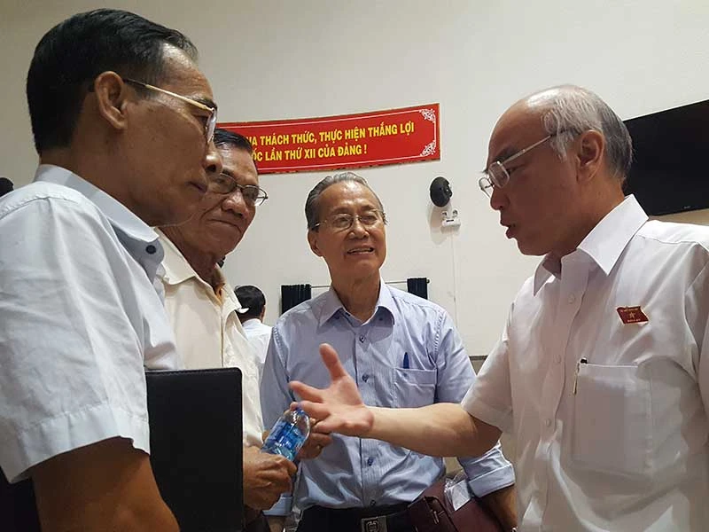Ông Phan Nguyễn Như Khuê, Phó Trưởng đoàn đại biểu Quốc hội TP.HCM, trao đổi với các cử tri tại buổi tiếp xúc. Ảnh: TÁ LÂM