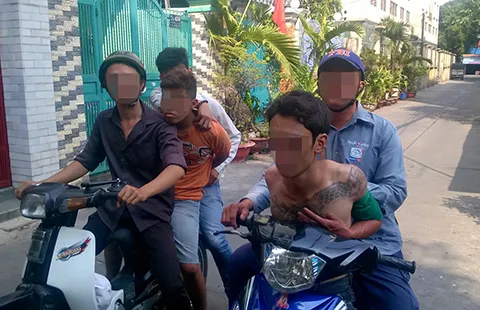 Hai đối tượng cướp giật bị các “hiệp sĩ đường phố” bắt quả tang trong một con hẻm ở quận 10. Ảnh: CTV
