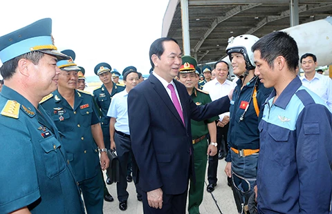 Chủ tịch nước Trần Đại Quang thăm hỏi cán bộ, chiến sĩ Trung đoàn Không quân 925 tại huyện Phù Cát (Bình Định). Ảnh: TTXVN
