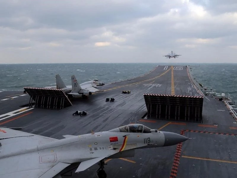 Các chiến đấu cơ J-15 của Trung Quốc bay từ tàu sân bay Liêu Ninh trong một cuộc tập trận ở Hoàng Hải vào ngày 23-12-2016. Ảnh: AFP