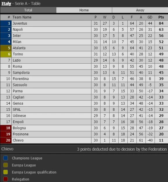 Ngược dòng thành công, Juventus tiến gần hơn đến chức vô địch Serie A khi vững vàng ở đỉnh bảng với 84 điểm, hơn đội đứng thứ hai là Napoli đến 21 điểm, trong khi Napoli còn 1 trận chưa đấu.