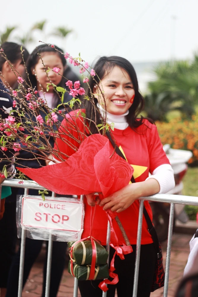 Chị tâm sự đã có mặt ở sân bay từ 9 giờ sáng. “Đây là bánh do tôi tự gói, tôi muốn được tự tay tặng thầy (HLV Park Hang-seo) cành đào và đôi bánh này để thầy thấy được hương vị tết ở Việt Nam đang đến gần và cảm nhận được tình cảm của người Việt Nam dành cho thầy”, chị Thắng bày tỏ.