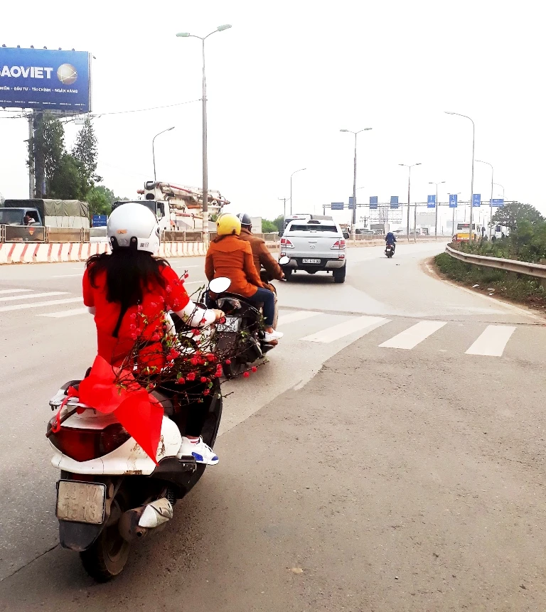 Không có cơ hội được tặng bánh chưng và cành đào cho HLV Park Hang-seo, chị Thắng thoáng buồn và dắt tay con nhỏ trở về với đôi bánh và cành đào cắm trên xe.