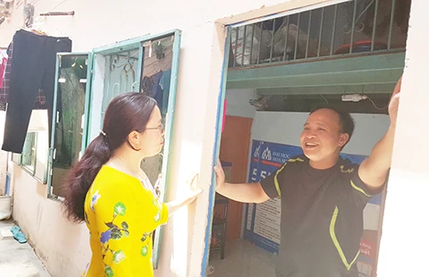 Chị Trần Thị Thanh Nết trò chuyện với anh Nguyễn Văn Cường, một người thuê trọ ở đây đã chín năm. Ảnh: HM