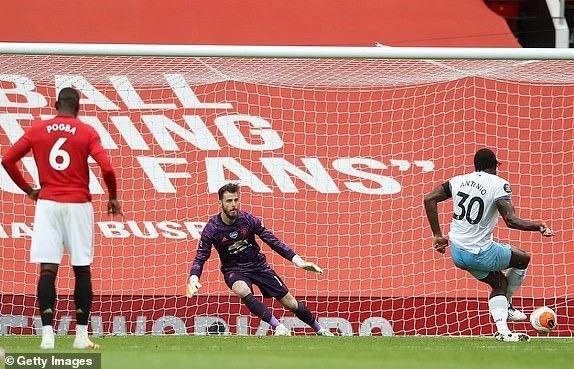 Phút 45+2, Antonio không mắc sai lầm nào sút bóng đánh lừa thủ môn De Gea mở tỉ số 1-0 cho West Ham. Ngay sau đó, trọng tài cũng thổi còi kết thúc hiệp 1 trận đấu.