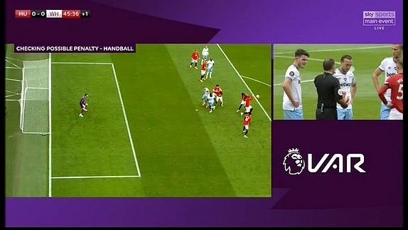 Thế trận cù cưa đến cuối hiệp một thì bất ngờ xảy ra. Pogba vụng về dùng tay chơi bóng trong vòng cấm sau cú sút rất mạnh của cầu thủ West Ham. Sau khi tham khảo VAR, trọng tài chỉ tay vào chấm 11m.