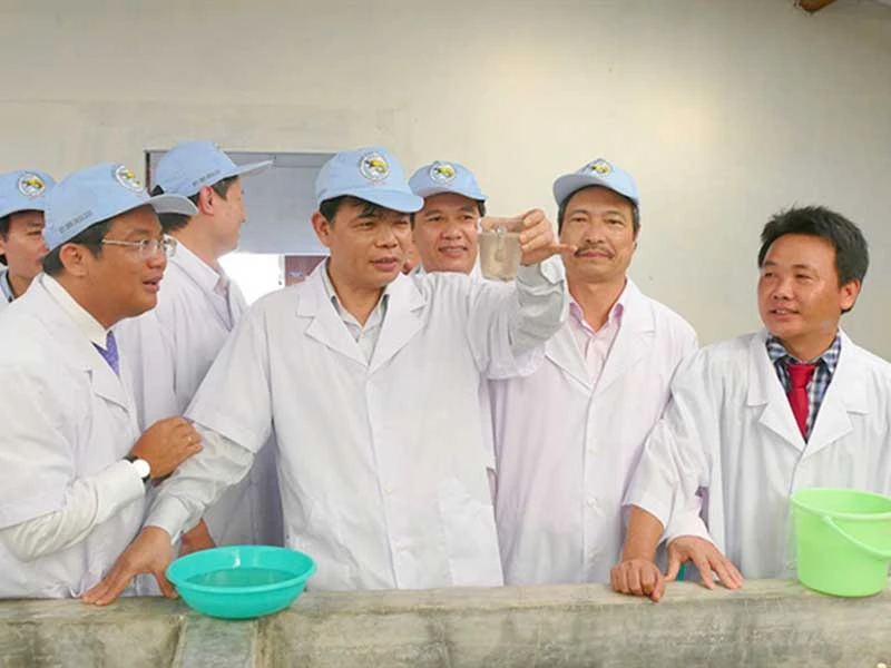 Bộ trưởng Bộ NN&PTNT khảo sát quy trình sản xuất tôm giống tại Công ty TNHH Nam Miền Trung (Vĩnh Hảo, Bình Thuận). Ảnh: NNVN