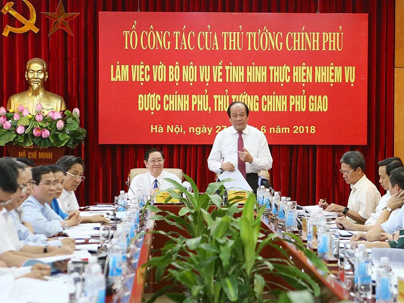 Chiều 27-6, Tổ công tác của Thủ tướng Chính phủ do Bộ trưởng, Chủ nhiệm Văn phòng Chính phủ Mai Tiến Dũng, Tổ trưởng Tổ công tác, dẫn đầu đã làm việc với Bộ Nội vụ về tình hình thực hiện nhiệm vụ được Chính phủ, Thủ tướng Chính phủ giao.