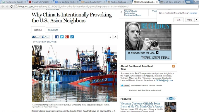 Bài báo trên tờ Wall Street Journal của Mỹ từng đặt câu hỏi “Vì sao Trung Quốc cố tình khiêu khích Mỹ và các nước châu Á láng giềng” với hình ảnh là tàu cá Việt Nam bị tàu Trung Quốc đâm chìm - Ảnh chụp lại từ màn hình