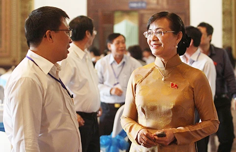 Chủ tịch HĐND TP.HCM Nguyễn Thị Quyết Tâm trao đổi với đại biểu bên lề kỳ họp. Ảnh: HOÀNG TRIỀU
