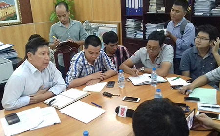 Ông Lê Hoàng Miinh (ngoài cùng bên trái) tại cuộc trao đổi thông tin với các báo chiều 12-7.