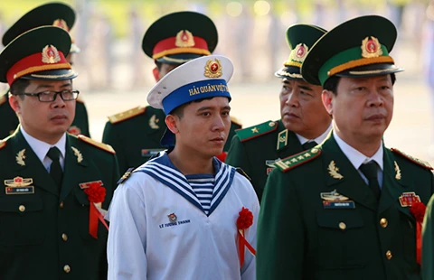 Các đại biểu trong lực lượng vũ trang trên đường vào lăng viếng Bác. Ảnh: LĐO