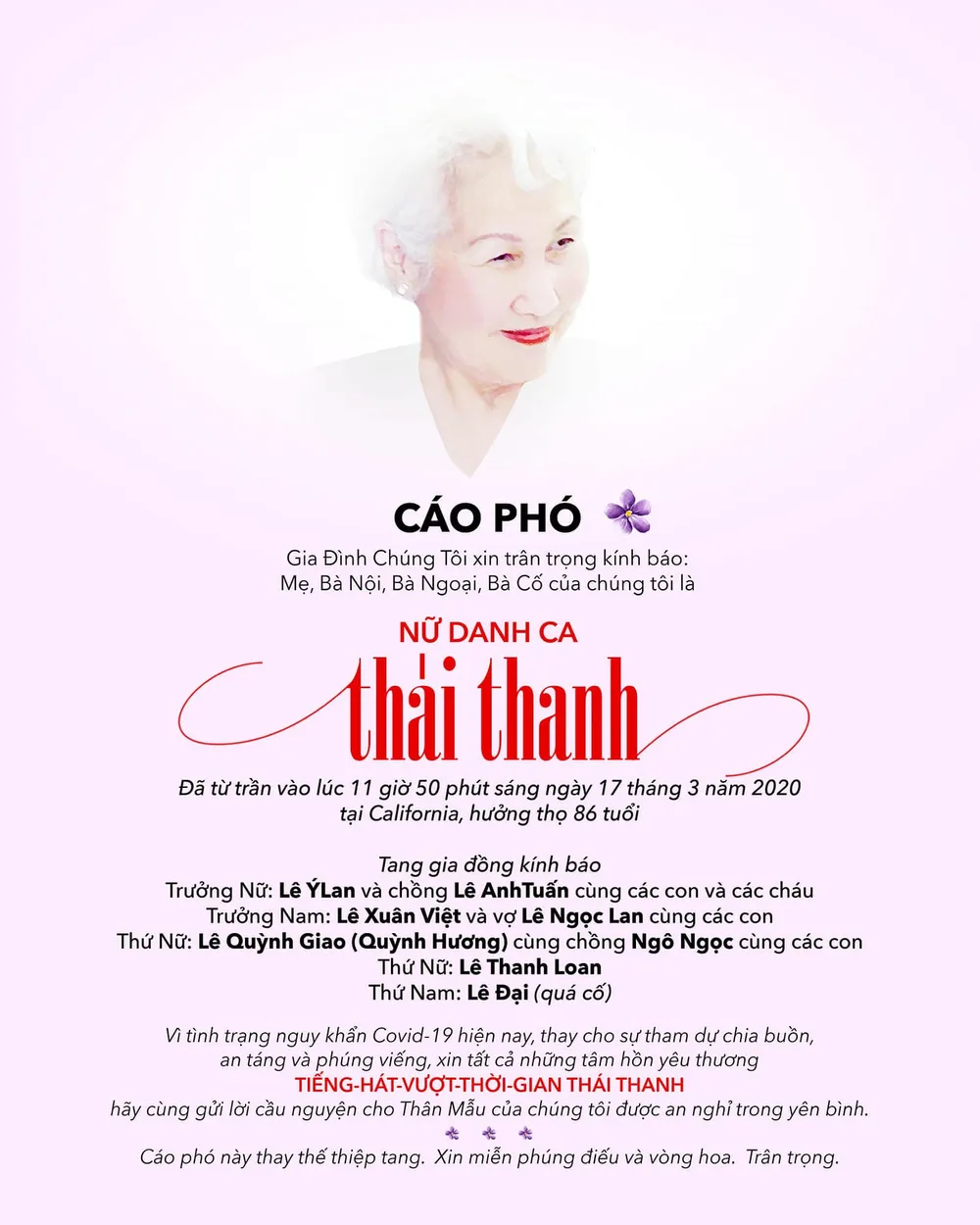 Trong cáo phó, gia đình nữ danh ca Thái Thanh ghi rõ: “Vì tình trạng nguy khẩn COVID-19 hiện nay, thay cho sự tham dự chia buồn, an táng và phúng viếng, xin tất cả những tâm hồn yêu thương Tiếng hát vượt thời gian Thái Thanh hãy cùng gửi lời cầu nguyện cho Thân Mẫu của chúng tôi được an nghỉ trong yên bình”.
