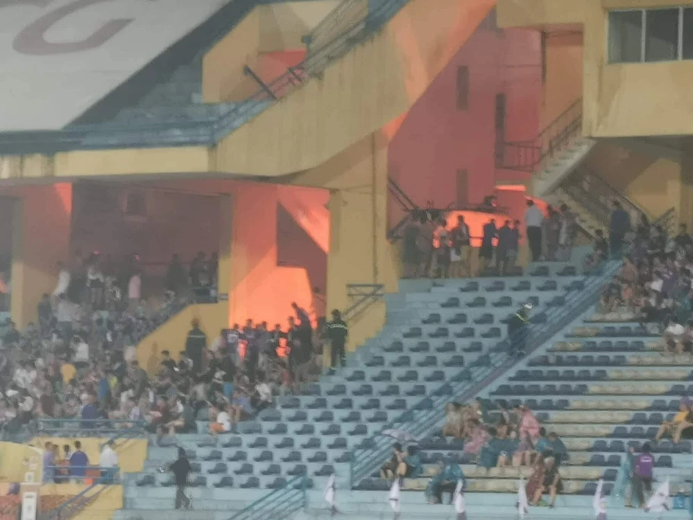 Pháo sáng trên sân Hàng Đẫy ngày 21-4 trong trận Hà Nội tiếp Hải Phòng. Ảnh: NGỌC DUNG