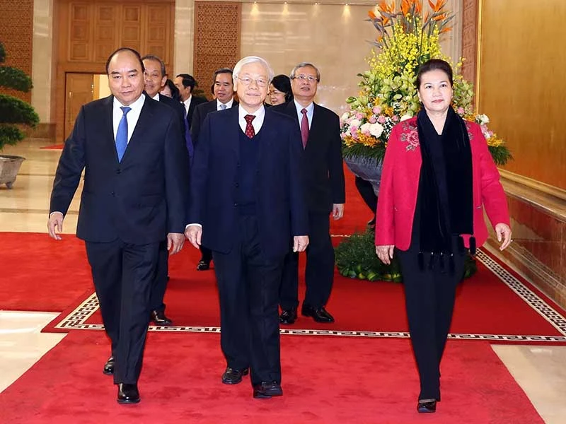 Tổng Bí thư, Chủ tịch nước Nguyễn Phú Trọng, Thủ tướng Nguyễn Xuân Phúc, Chủ tịch Quốc hội Nguyễn Thị Kim Ngân đến dự hội nghị. Ảnh: TTXVN