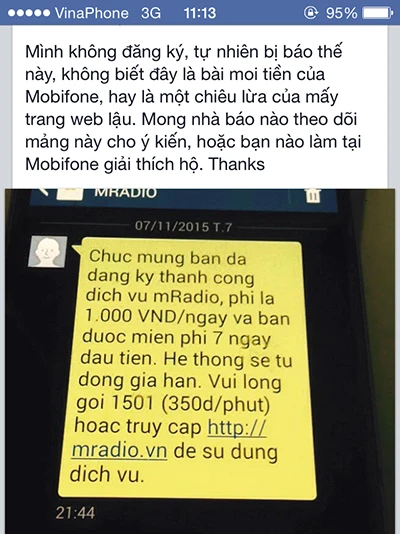 Trường hợp của bà Quỳnh Chi, dùng số thuê bao trả sau mạng Mobifone (0903xxxx67) cũng bị nhà mạng tự đăng ký dịch vụ VAS. Đó là dịch vụ mRadio, mỗi ngày 1.000 đồng, sử dụng miễn phí bảy ngày đầu và sau đó nhà mạng sẽ tự động gia hạn. Chia sẻ trên trang cá nhân ở Facebook, bà Chi nói: “Mình không đăng ký, tự nhiên bị báo thế này. Không biết đây là bài moi tiền của Mobifone hay chiêu lừa của mấy trang web lậu”.