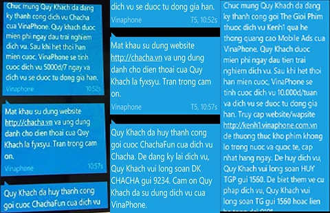 Chưa hết, mới đây ông Ngọc vừa lên mạng xem thông tin tại một website về ô tô thì nhận được tin nhắn từ tổng đài VinaPhone: “Chúc mừng quý khách đã đăng ký thành công dịch vụ chacha của VinaPhone. Quý khách được miễn phí ngày đầu trải nghiệm dịch vụ. Sau khi hết thời hạn miễn cước, VinaPhone sẽ tính cước dịch vụ 5.000 đồng/bảy ngày và dịch vụ sẽ tự động gia hạn. Mật khẩu sử dụng website http://chacha.vnvà ứng dụng dành cho điện thoại của quý khách là fyxsyu”.