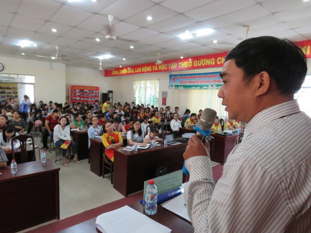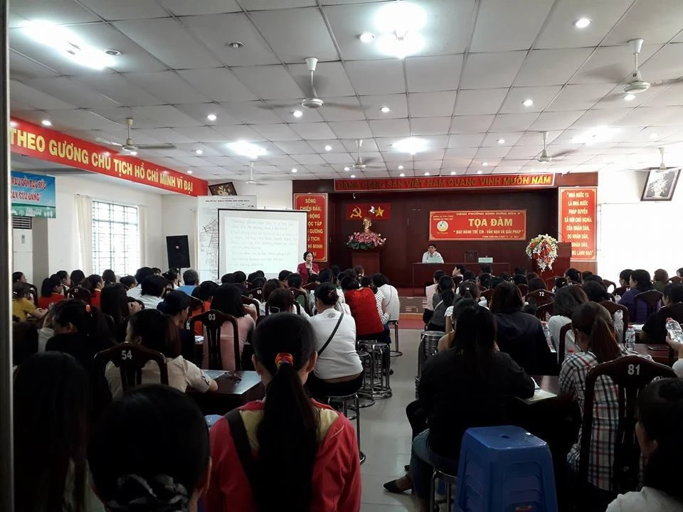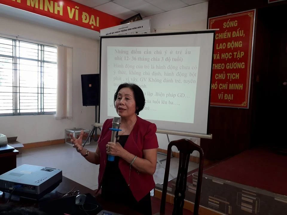 Tại buổi tọa đàm, hơn 400 giáo viên, bảo mẫu của ba trường công lập, 11 trường tư thục và 53 nhóm trẻ trên địa bàn phường trao đổi sôi nổi. Họ lắng nghe những lời tâm huyết, chia sẻ nghề từ chuyên gia-TS Đinh Thị Tứ. Ảnh: AN - NT