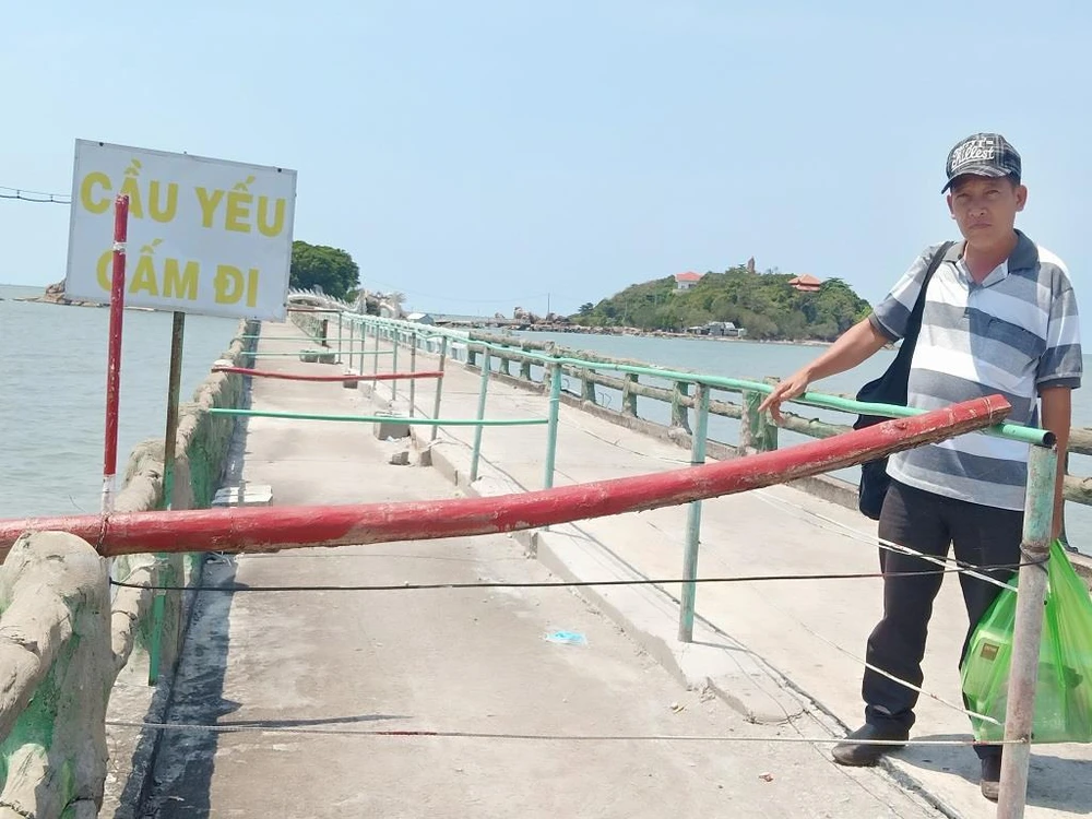 Một phần cầu dẫn vào Hòn Đá Bạc đã hư hỏng một năm qua chưa được sửa chữa. Ảnh: Trần Vũ