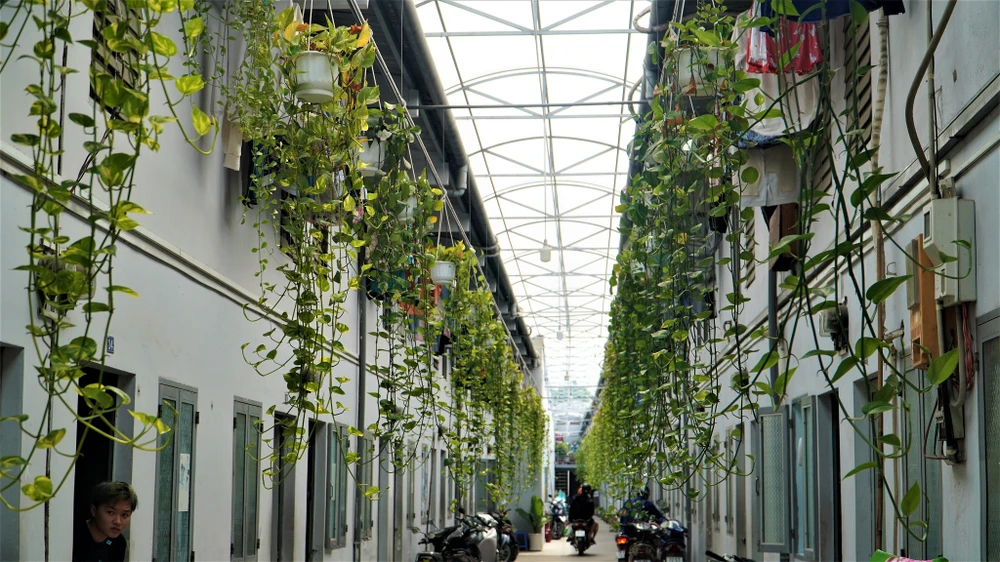 Không gian sống tại dãy trọ đẹp mắt hơn hẳn nhờ dàn cây leo. Ảnh: HUỲNH THƠ