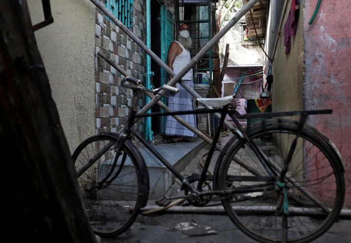 Một người dân ở khu Dharavi dùng xe đạp và gậy gộc để chắn đường, ngăn người lạ vào khu vực nhà mình nhằm hạn chế lây lan COVID-19. Ảnh: REUTERS